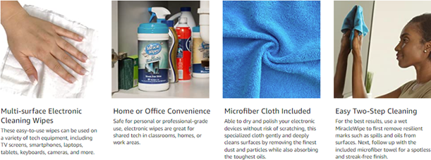 - ANTI-STATIC, MIRACLE WIPES for electronics are designed to clean external areas on electronic devices and won’t cause damages to screens or surfaces. They will help lift away fingerprints, food particles, spills, watermarks, and skin oils while leaving behind a clear finish.