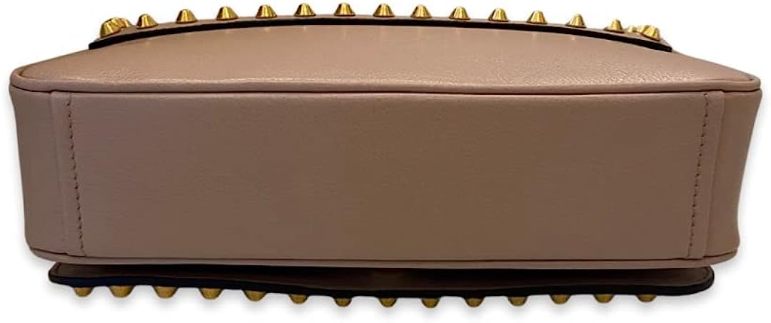 • This Cammeo beige calfskin leather is appropriate for any season, adorned with stud accents in a gold finish. The magnetic snap closure opens to a black jacquard lined interior with a zipper and patch pocket.