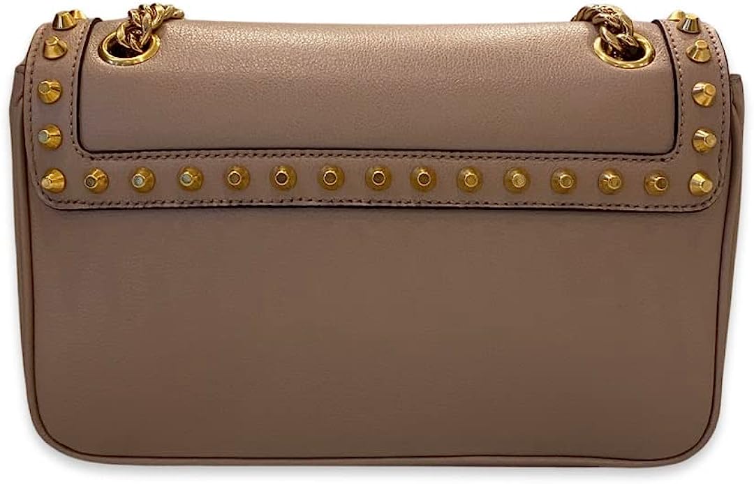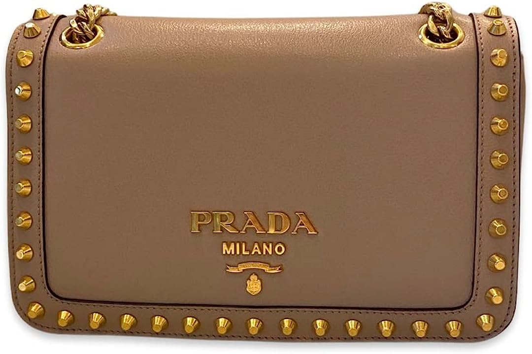 • The chain and beige leather strap can be doubled and worn on the shoulder or as a crossbody. This show stopping Prada crossbody bag is sure to highlight any ensemble! Model number: 1BD147 Color: Beige Glace calf leather Gold hardware Stud accents Magnetic closure Interior black jacquard lining One interior zipper pocket One interior open slot pocket Magnetic snap button closure Gold raised logo plaque