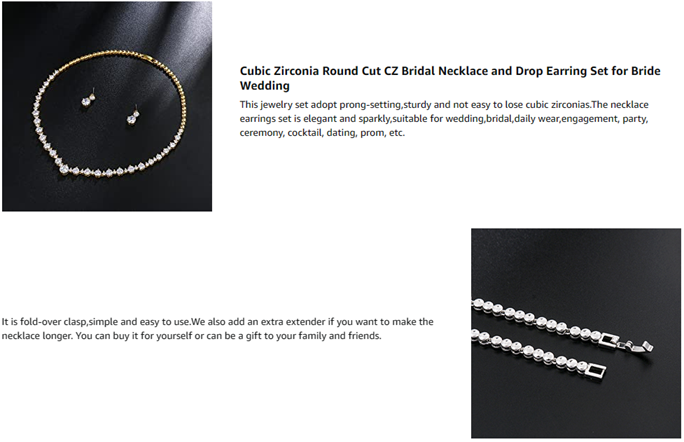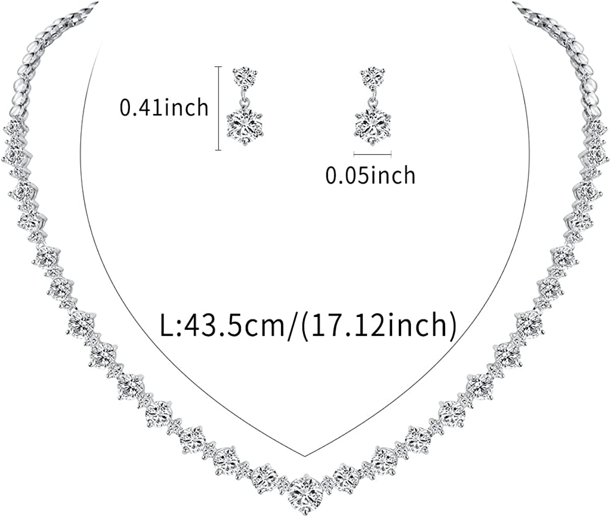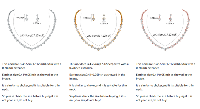 • Necklace length:17.12 inch(43.5cm),earrings size:0.41 inch*0.05 inch as showed in the second picture,we aslo add a 0.78inch extender,be sure to measure your neck size before buying,maybe it will be small or large for you!!!