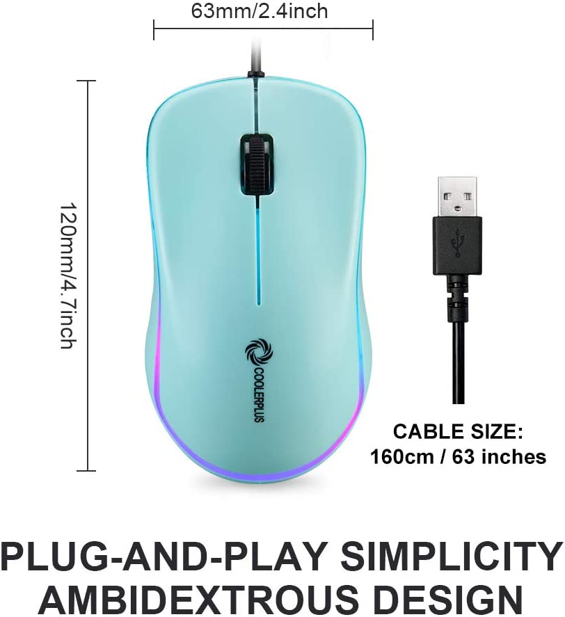 Plug and Play USB Mouse with rainbow light, Precise tacking and easy selction, No need to install any other drivers or software. The high-quality USB plug make the mouse easy to use and stable. Coolerplus mouse with flash rainbow light.