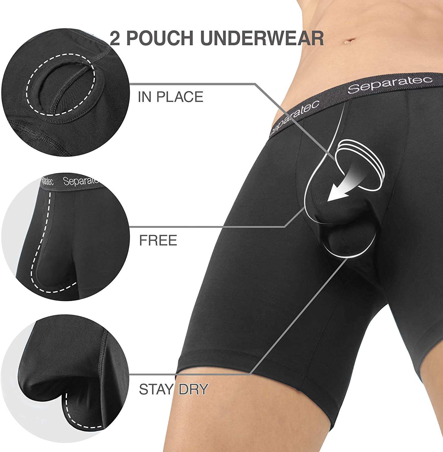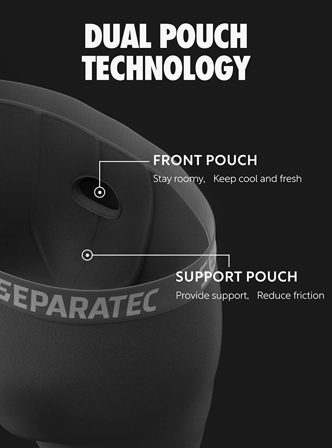 • Innovative Separate Pouches Tech: 2 pouch underwear keep man's intimate areas comfortably separated without annoying squeeze.Front pouch sustains a fresh environment and lower pouch provides support and air movement.