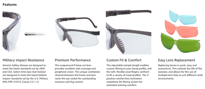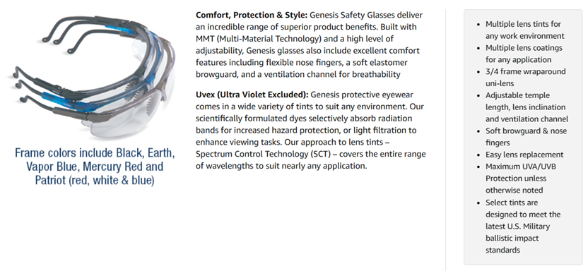 The Uvex Genesis is the best selling safety eyewear in the world, offering the best in comfort, protection and style. Built with patented Multi-Material Technology and a high level of adjustablilty, the Uvex Genesis delivers a broad range of superior benefits. Genesis provides workers with extraordinary all-day comfort and raises the bar on compliance. Made in the USA.
