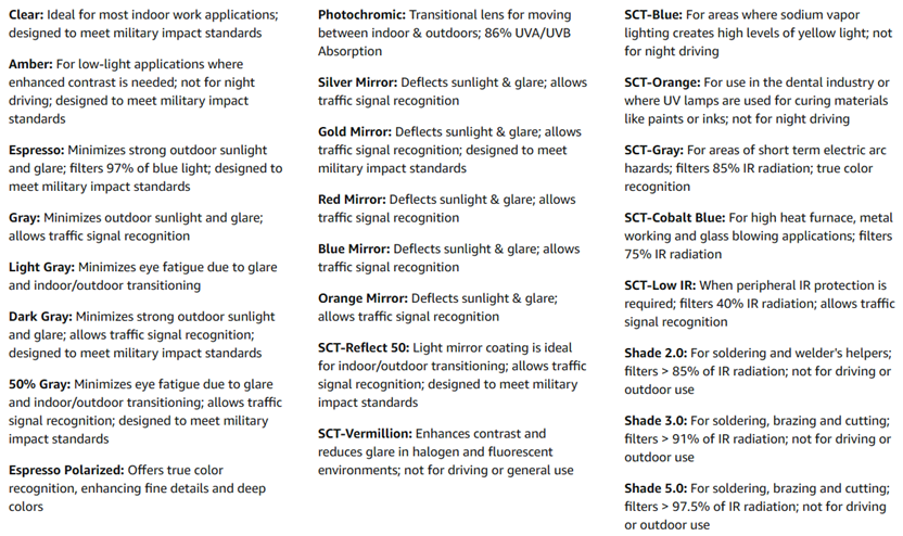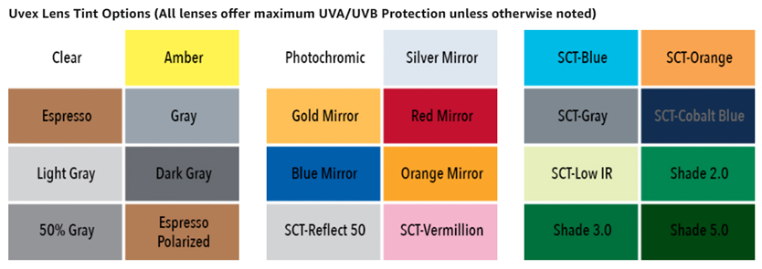 • LENS TINTS FOR ANY TASK: Uvex lens tint applications include sun & glare reduction, fluorescent/halogen/sodium lamp low light areas, indoor/outdoor transition, welding and traffic signal recognition