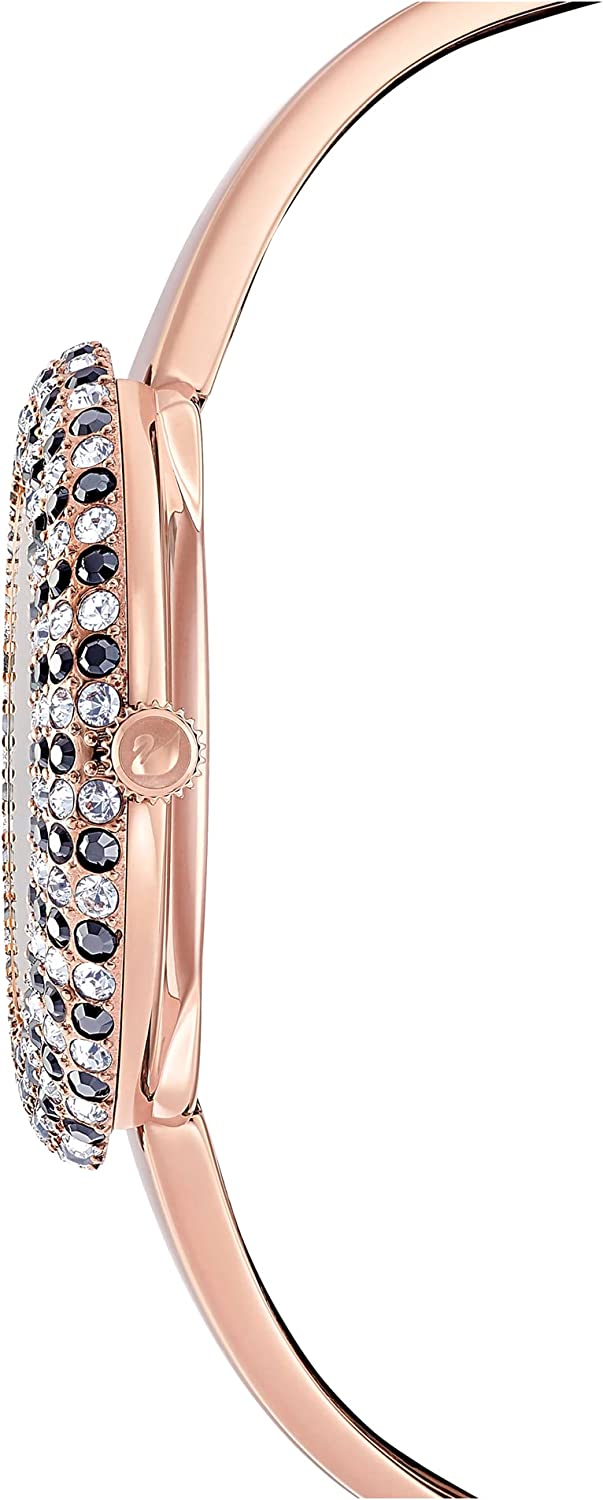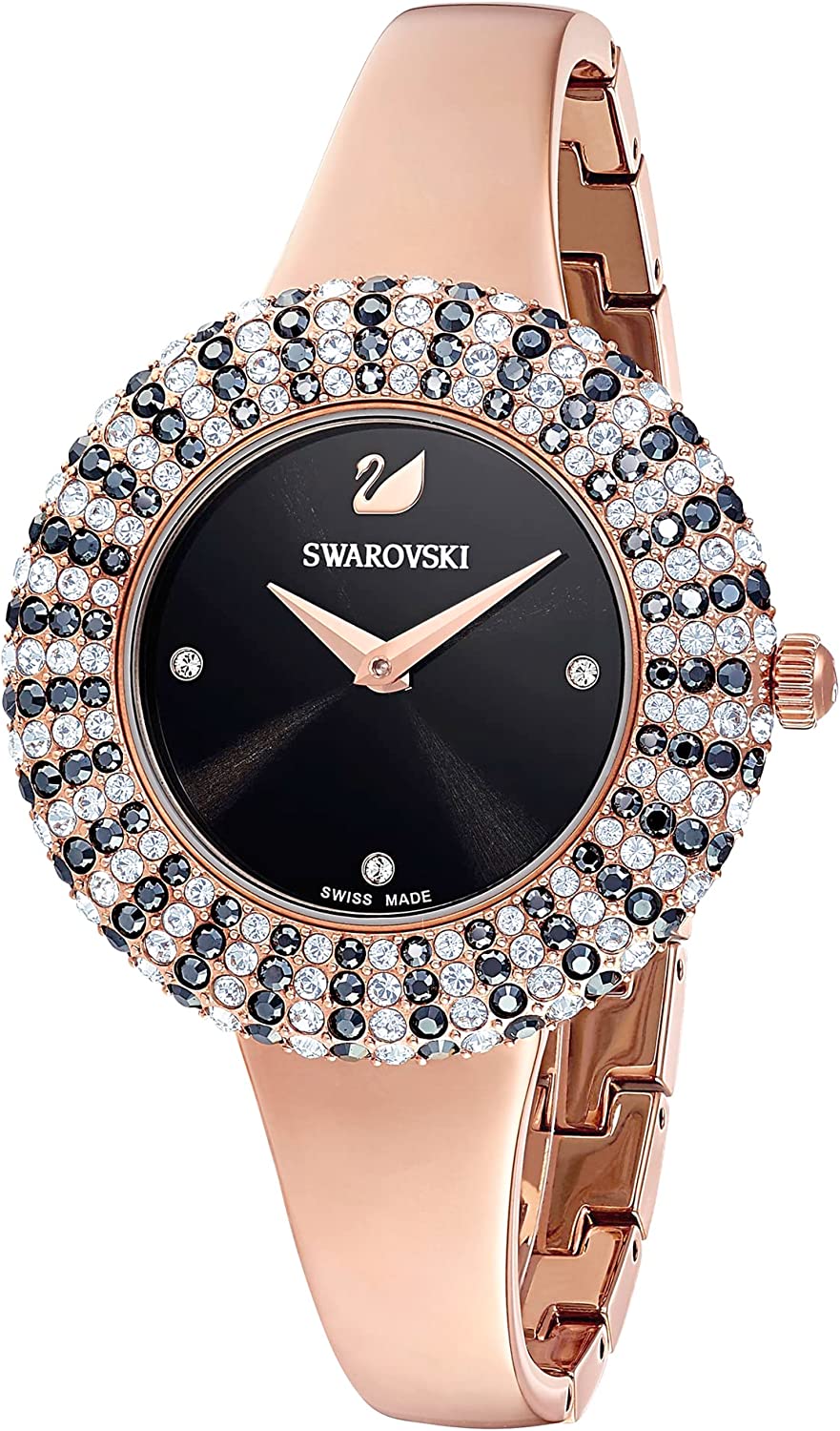Items delivered: 1 x Swarovski Crystal Rose watch for women, 6 1/2 inch rose-gold tone stainless steel band, 1 1/4 inch crystal accented stainless steel case and black dial, with Swarovski watch box