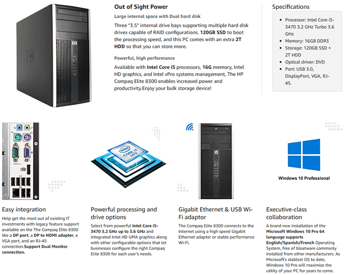 • HP Elite 8300 Tower Desktop,Intel Quad Core i5 3.20GHz, 16GB RAM, 2TB HDD, 120GB SSD