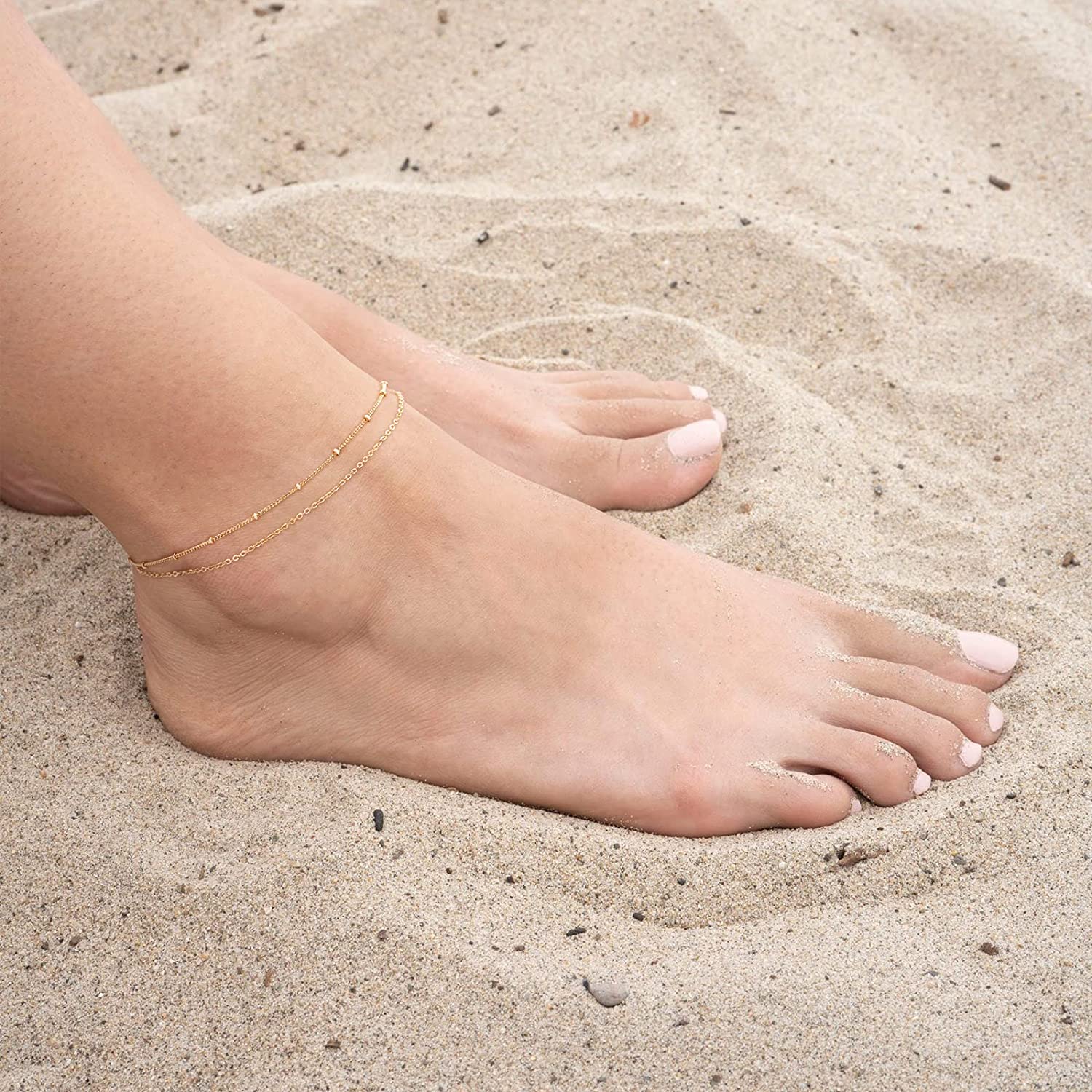 Women Dainty Anklet,14K Gold Plated Satellite Anklet Double Layered Cute Beads Chain Tassel Coin Disc Heart Summer Ankle Bracelet Boho Beach Foot Chain