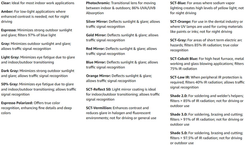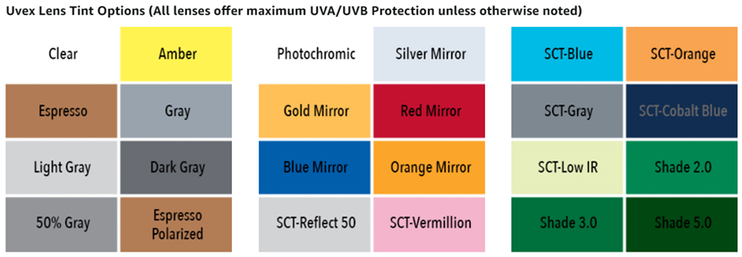 • LENS TINTS FOR ANY TASK: Uvex lens tint applications include sun & glare reduction, fluorescent/halogen/sodium lamp low light areas, indoor/outdoor transition, welding and traffic signal recognition