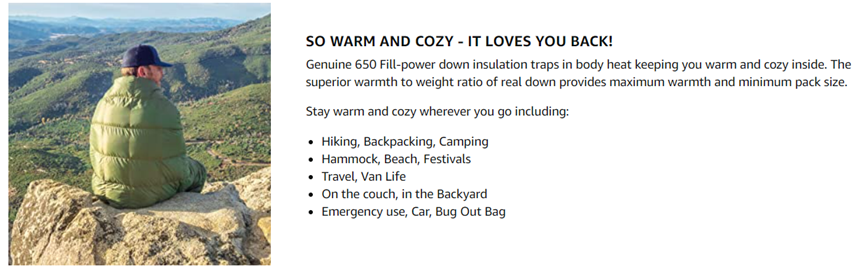 <b>COZY AND WARM</b> - A 20D ripstop nylon shell blocks out wind and cold while 650 Fill Power down insulation keeps you cozy and warm inside.