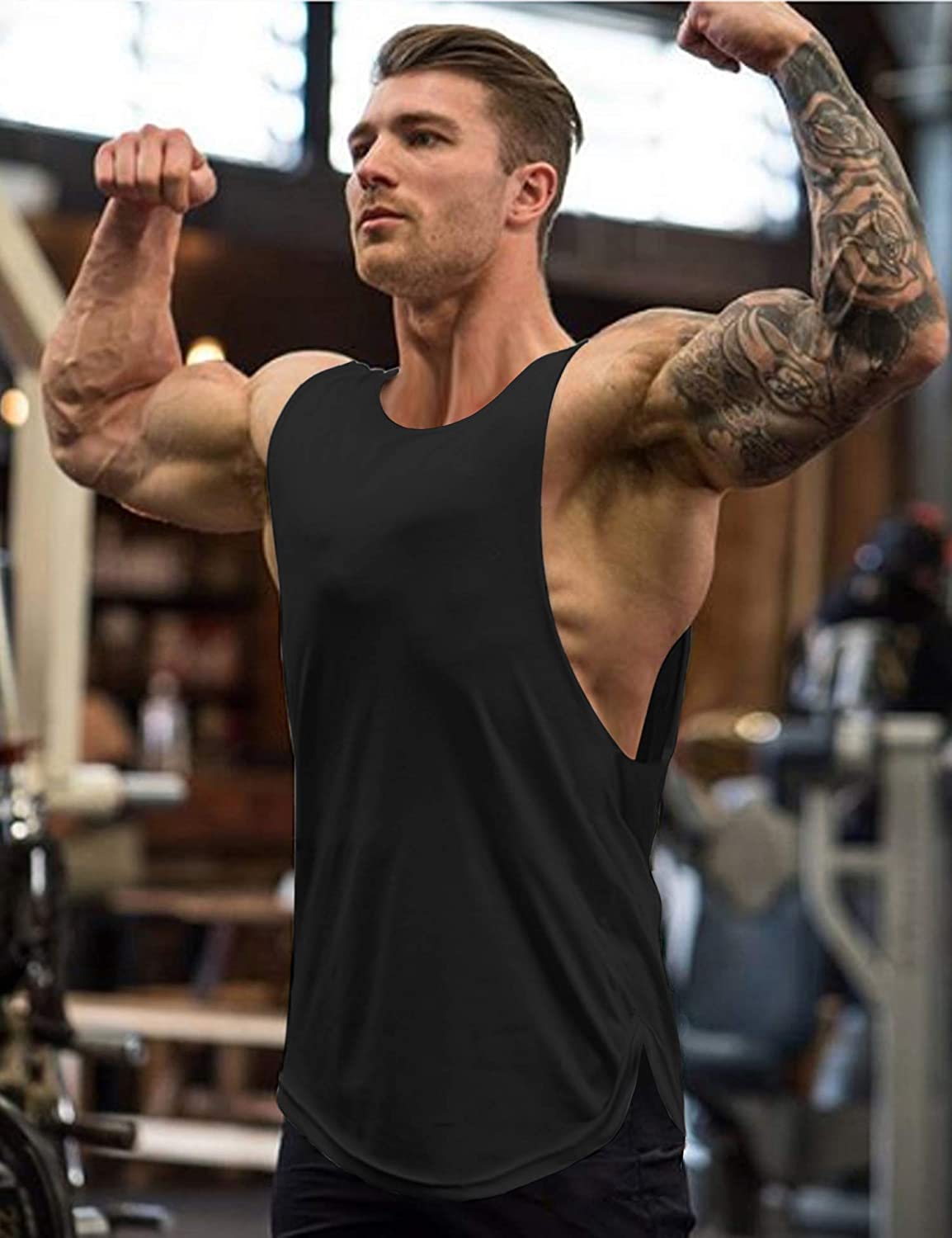 • The durable muscle tank boasts of a flawless athletic fit and neat solid stitching, professional cut and sleeveless design highlight your shoulders and arm muscles, longline loose feature ensures it to drape nicely on the body, large arm holes help show off your hard work at the gym, round hem and side slits gives great freedom during intense workouts.