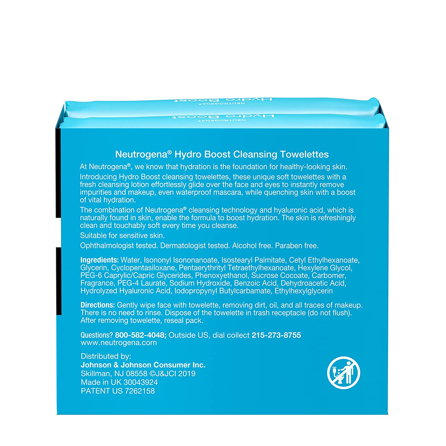 • Twin-pack of 25-count Neutrogena Hydro Boost Facial Cleansing Wipes made with hyaluronic acid and a micellar-infused, triple emollient gently cleanse skin and remove makeup while providing a boost of hydration and moisture