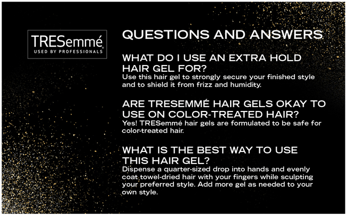 The best styling gel should hold your style without causing a sticky situation. TRESemmé Extra Hold Hair Gel delivers all-day-long humidity resistance and holds your style without stiffness, stickiness, or crunchiness. Built for frizz control and ready to be styled, this Extra Hold Gel fights frizz all day long with 24-hour humidity protection while continuously holding your style in place. This hair styling gel can be used on any hair type and hairstyle that requires hold and definition. Our unique, alcohol-free hair gel formula is great for all hair types and is designed to add lasting shine to your style. Prep hair with your favorite TRESemmé shampoo and conditioner. Once hair is ready to be styled, start by dispensing a quarter-sized drop of TRESemmé Extra Hold Hair Gel into your hands and use your fingers to coat the hair, creating your preferred style evenly. Add more product as needed. TRESemmé is an industry leader in providing salon-ready hair quality products.
