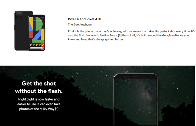Pixel 4 is the phone Made the Google way. So it’s built around the helpful Google software you know and love, that’s always getting better. 1)Learn more about Astrophotography on Pixel 4. 2) U.S. only. English only. 3) Coming soon to Japan. Motion sense functional in the U.S., Canada, Singapore, Australia, Taiwan, and most European countries. Not all phone features are controlled by motion sense. 4) Us & Canada only. English only. 5) Approximate battery life based on a mix of talk, data, standby, mobile Hotspot and use of other features, with motion sense off and always on display off. Use of motion sense, an Active display or data usage will decrease battery life. Pixel 4 and 4 XL testing conducted in Mountain View, California in August 2019 on pre-production hardware and software. Actual results may vary. 6) Up to 10 W with Pixel 4 and Pixel 4 XL charging with Pixel Stand (Sold Separately). Actual results may vary. 7) Support nano SIM and eSIM (carrier dependent); Supports only usb type-c headphone Jack & Bluetooth connections; Does not Support Expandable storage.