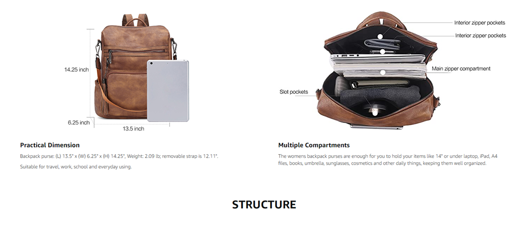 • Multiple Compartments:1 main compartment with 2 inner zipper pockets, 2 inner slot pocket, 2 front zipper pockets, 2 side pockets and 1 back zipper pocket. Different sizes pockets are enough for you to hold your items like 14" or under laptop, iPad, A4 files, books, umbrella, sunglasses, cosmetics and other daily things, keeping them well organized.