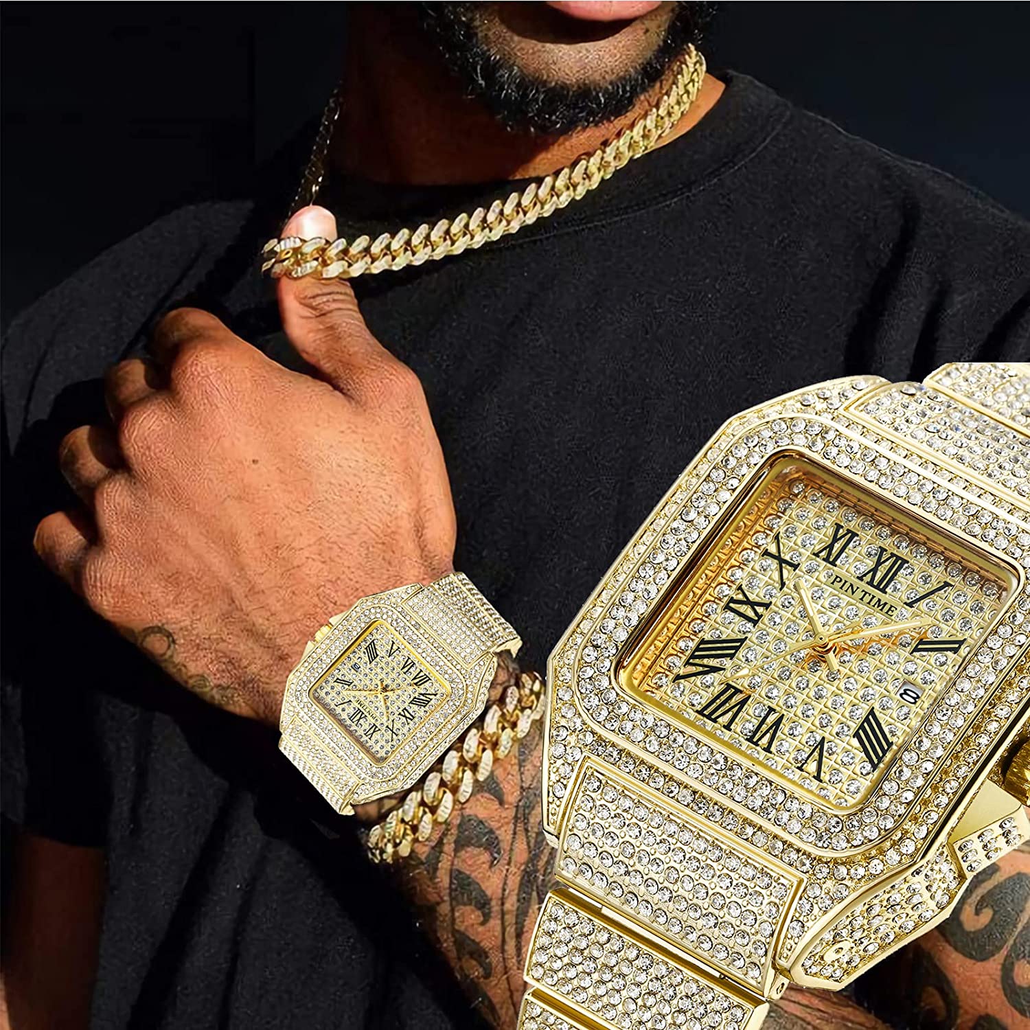 • Mens Design: Iced out luxury fashion watch for men. Big square full crystal 43mm face. Decorative screws in case and strap. Crown protective ear design. Wide Roman numeral markers and fluorescent sword hands. Date window at 3 o'clock.