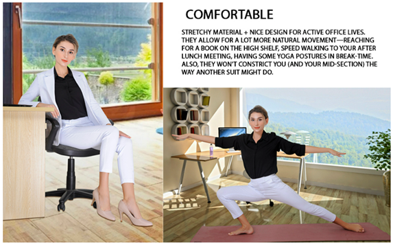 MOST COMFORTABLE PANT SUITS you'll ever wear to work: - Made of Durable, Ultra-comfy, 4-way stretch ponte fabric. You can look professional in office while performing hardest yoga postures in Lunch time.