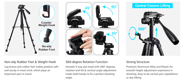 • 【Support All Shooting Angles】Thanks to its versatile pan head, It adjusts to multiple shooting angles in seconds, including landscape mode, portrait mode, low-angle shots, high-angle shots and 360 ̊ Panoramic Shot. Anyone can learn to be on camera and experience the fun of shooting.