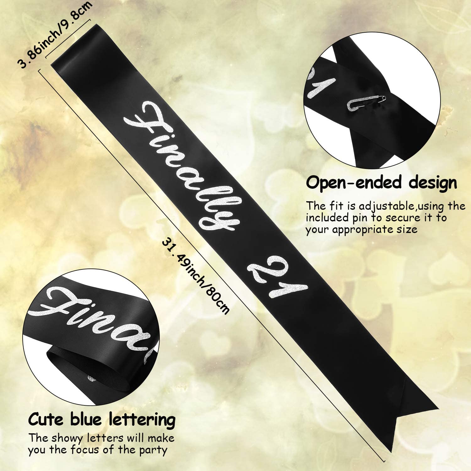• 21st Birthday sash: this birthday sash is made of polyester ribbon, which is much thicker, neater and smoother than other double-sided polyester sash, it can be applied directly without ironing, the pleasing color combinations of black and sliver is easy to match any birthday outfit