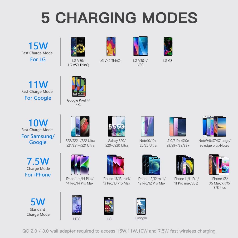 - ▶[15W, 11W,10W, 5W WIRELESS CHARGING Modes]: 15W FAST WIRELESS CHARGING MODE ONLY FOR LG V50 THINQ/V50/V40 THINQ/V35/V30+/V30/G8 THINQ/G8/G7 THINQ/G7, USING QC2.0/QC3.0 ADAPTER(12V,1.5A); 10W charging mode using QC2.0/QC3.0 adapter(9V,1.67A) is for Samsung Galaxy S22/S22 Ultra/S21/S20/Note 10/Note 10 Plus/S10/S10 Plus/S10E/Google Pixel 3/3 XL; 11W charging mode for Google Pixel 4/4XL, 5W for all wireless-charging-enabled smartphones. Please use the most appropriate adapters for best results.