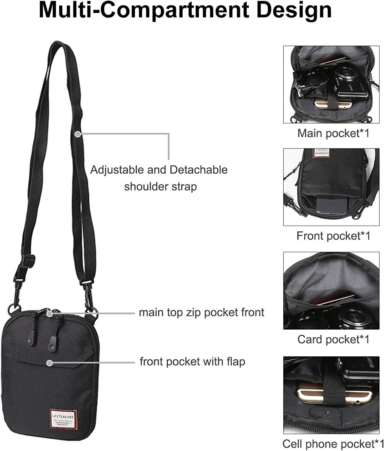 • ★Construction: 4 main compartments / 1 main top zip pocket +1 smaller card pocket +1cell phone pocket with fixing strap+ 1 front pocket with flap + 1 detachable shoulder strap +1 removable metal carabiner