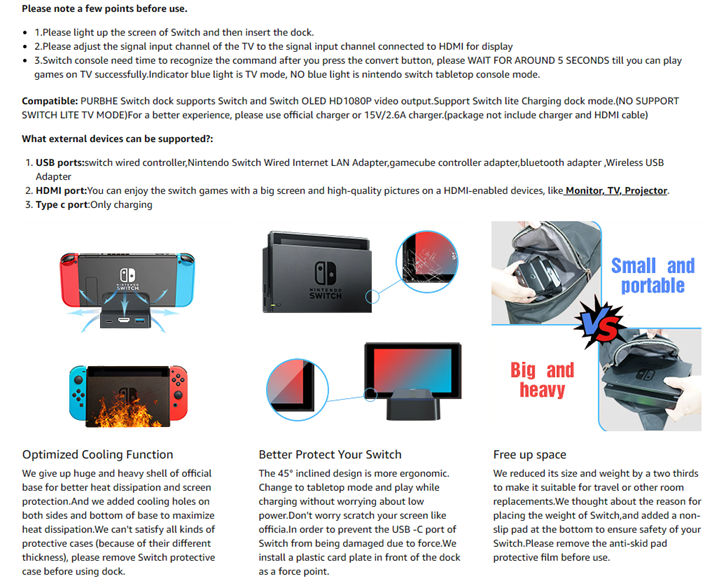 • About Switch TV Dock:PURBHE Switch dock supports Switch and Switch OLED HD1080P video output.Indicator blue light is TV mode, NO blue light is nintendo switch tabletop console mode.If your dock not work or have other concerns in daily use. Feel free to contact us by your Amazon email. We would reply most email within 8 hours
