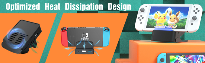 • Optimized Cooling Function: the bottom and sides of this dock are equipped with unique cooling holes, which greatly improves the problem of poor heat dissipation on the dock Nintendo Switch original. Good heat dissipation not only extends the battery life of the Nintendo Switch, but also avoids other problems caused by overheating of the device.