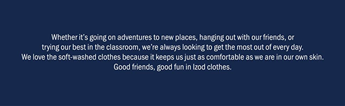 IZOD is an All-American brand known for comfort, color, and a weekend state of mind. Whether it's for day-to-day or special occasions, IZOD for kids has the comfortable fits and soft fabrics that'll keep them looking and feeling good.IZOD es una marca estadounidense conocida por su comodidad, color y estilo de fin de semana. Ya sea para el día a día o para ocasiones especiales, IZOD para niños tiene los ajustes cómodos y telas suaves que los mantendrán con un aspecto y una buena sensación.IZOD ist eine amerikanische Marke, die für Komfort, Farbe und einen Geisteszustand am Wochenende bekannt ist. Egal ob für den Alltag oder besondere Anlässe, IZOD für Kinder hat eine bequeme Passform und weiche Stoffe, mit denen sie gut aussehen und sich gut anfühlen.