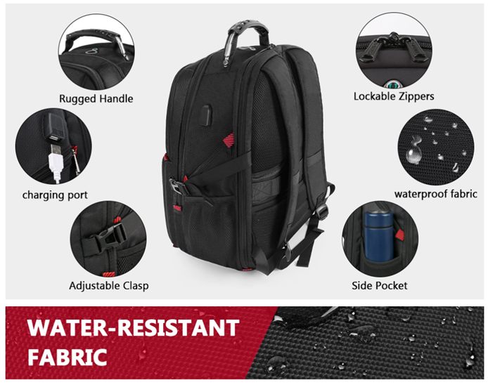 Practical & Convenient: External USB port with built-in charging cable conveniently charges your phone and other electronic devices (pls provide your own portable charger). A hole in the travel laptop backpack is used for the outside of the earphone, which can be used conveniently. Besides, the large laptop backpack has a sturdy handle with a steel cable on top for easy portability. Side compression straps keep the exclusive pack in any size you need