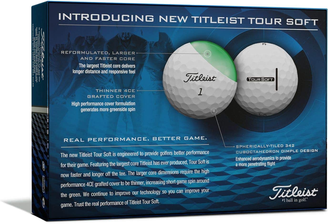 Titleist Tour Soft Golf Balls REAL PERFORMANCE. BETTER GAME. The all new Titleist Tour Soft golf ball delivers responsive soft feel, commanding distance, and excellent short game performance. Now available in both White and High Optic Yellow. BENEFITS Responsive Soft Feel Faster Ball Speeds for Category-Leading Distance Increased Short Game Spin A More Penetrating Ball Flight Improved, Easy Alignment FEATURES Reformulated, Larger and Faster Core Thinner 4CE Grafted Cover Spherically-Tiled 342 Cuboctahedron Dimple Design New Alignment Stamp