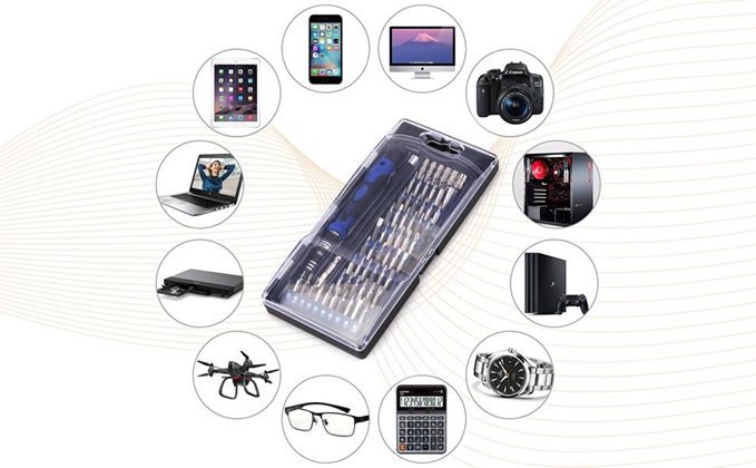 Included Components‎screwdriver bits (Phillips, Flathead, Torx, Torx Security, Pentalobe screwdriver and more), Screwdriver Handle, Flexible Shaft Extension Rod, Solid Shaft Extension Rod, 1/4-4mm Driver Adapter