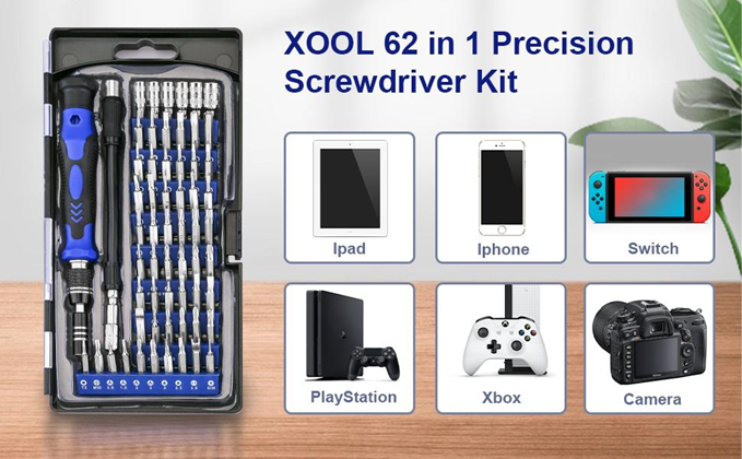 • 【Wide Application】 XOOL 62 in 1 precision screwdriver set is a professional repair tools kit for iPhone, iPad, MacBook, Cell Phone, PC, Computer, Laptop, Tablet, Camera, Game Consoles, PS4/Xbox Controller, Watches, Glasses and other electronics. Whatever you are a professional or amateur in the IT world, you can easily use this electronics tool kit to repair phones, computers and laptops.
