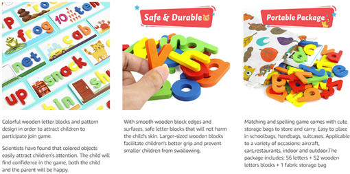 - High Quality Material: Smooth edge and surface of wood block, and color of the surface is made of environmentally friendly paint. Absolutely safety for children.Larger-size wooden blocks can prevent the risk of suffocation of children. Parents can rest assured that children complete the entire game system independently. They can easily build their confidence,includes improve children's letter recognition, spelling, word formation, and help early vocabulary recognition accumulation.
