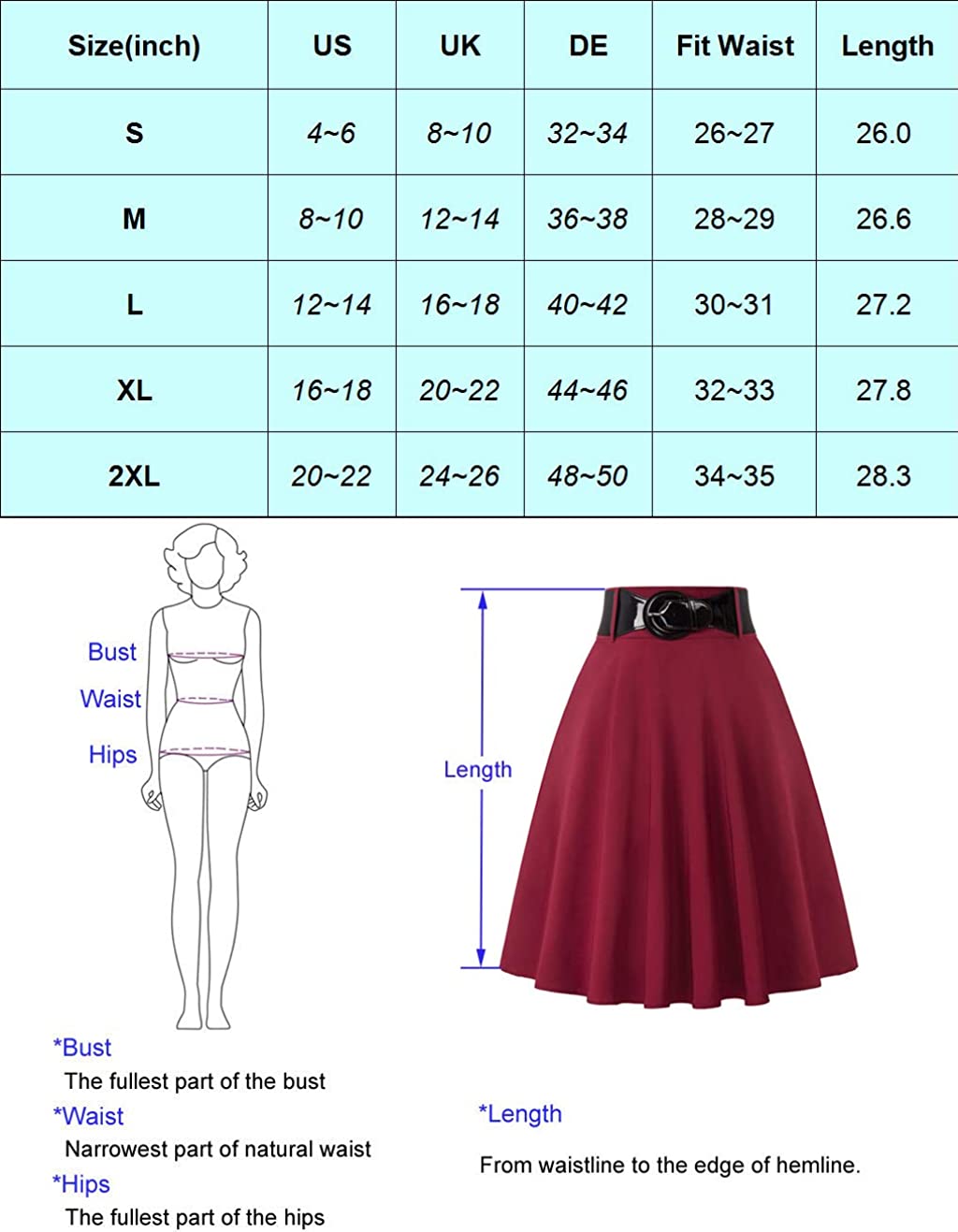 • Skirt Feature: High waist skirts with removable lether belt; Open side-seam pockets; Fixed belt adorns waist; Flared A-Line silhouette; Concealed zipper in the back