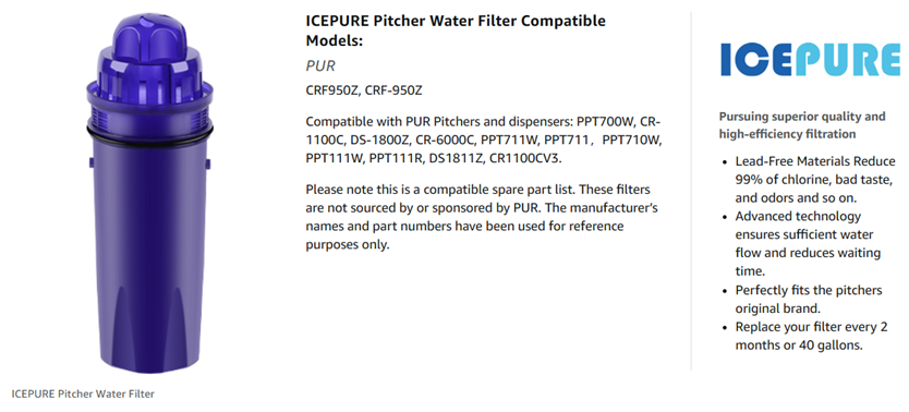 - ?????????? ??????‒ PUR pitchers and dispensers: PPT700W, CR-1100C, DS-1800Z, CR-6000C, PPT711W, PPT711, PPT710W, PPT111W, PPT111R, DS1811Z, CR1100CV3 and more. This compatible spare part list and the manufacturers' names and part numbers has been used for reference purposes only. ICEPURE is an independent brand.