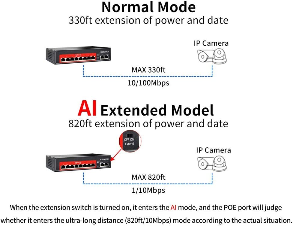 【AI 250 meters Extend function】Turn on the extension switch,it enters the AI mode,POE port will judge whether it enters the ultra-long distance (820ft/10Mbps) mode according to the actual situation).Extend function extending max power and data transmission distance from 100 meters(330ft) to 250 meters(820ft).which is easy to expand network via ethernet cable to somewhere without power supply but need fix device such as IP Cameras.