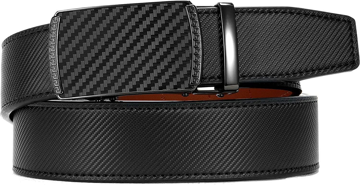 • Effortless to Use: Experience the ultimate convenience with our black leather belt. Simply slide it into the sliding buckle, pull it through, and the click-it buckle automatically locks in place. Releasing the belt is just as easy - gently push the lever on the side of the automatic buckle, and the lock snaps shut. Enjoy the seamless simplicity and smoothness of our ratchet belt design.