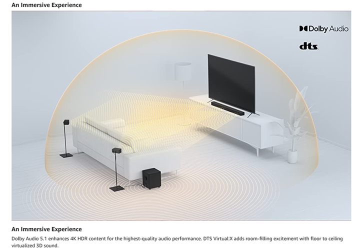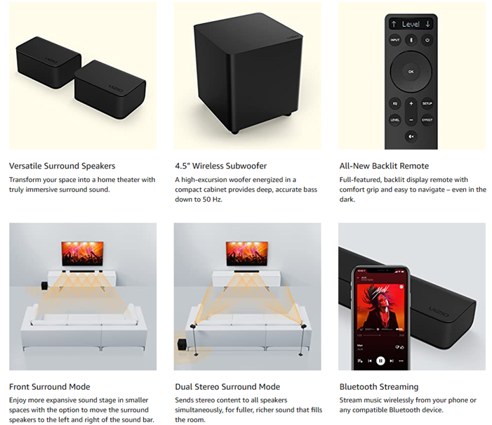 Hear what you’ve been missing with the newly designed VIZIO V-Series™ 5.1 Home Theater Sound Bar. The V-Series 5.1 offers immersive home theater surround sound, a sophisticated new look and HDMI connectivity for the highest-quality audio. Three full-range speakers--including a dedicated center speaker for crystal-clear dialogue--are all perfectly balanced within the slim sound bar. Also included are a pair of low-profile surround speakers to envelop the listener, and a wireless 5” subwoofer that brings booming bass. 4K HDR content is enhanced with Dolby Audio™ 5.1 for the highest-fidelity sound, and DTS® Virtual:X™ sound enhancement adds room-filling, floor-to-ceiling virtualized 3D sound to movies and music. Optional surround modes provide the versatility to play stereo music through the sound bar and surround speakers simultaneously, transforming any content into powerful 5.1 audio; or place the surround speakers up front, next to the sound bar, for more expansive virtual surround in smaller spaces. Voice Assistant Input gives you the convenience of a voice assistant you’re already accustomed to (sold separately) and lets you operate it right through the sound bar for an upgraded audio experience. You can also wirelessly connect your compatible phone for high-quality Bluetooth music streaming. Now with an elegant new backlit LCD display remote control, the VIZIO V-Series 5.1 Home Theater Sound Bar can help turn your living room into a captivating home theater.100-word description: French.