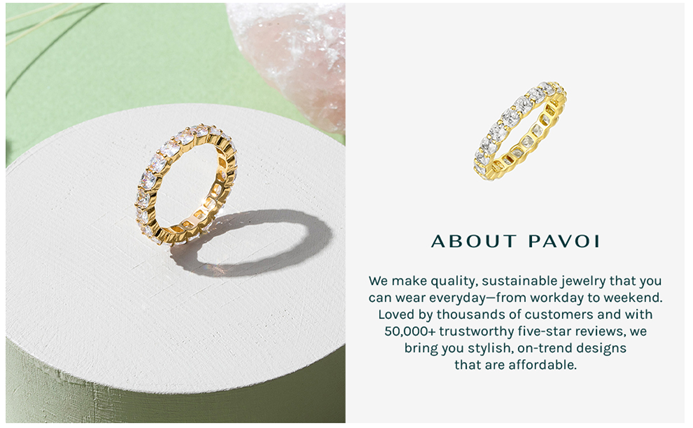 • ✦ SUSTAINABILITY ✦ PAVOI is dedicated to sustainability throughout our entire product cycle. Our jewelry is made from 100% recycled materials and we package in 99% recycled and compostable materials. We work to reduce our carbon emissions and offset plastic consumption by removing 275,000 bottles from oceans annually. We are committed to maintain a balanced and eco-friendly business that minimizes our environmental impact. Trust that PAVOI is continuously working towards a greener future.