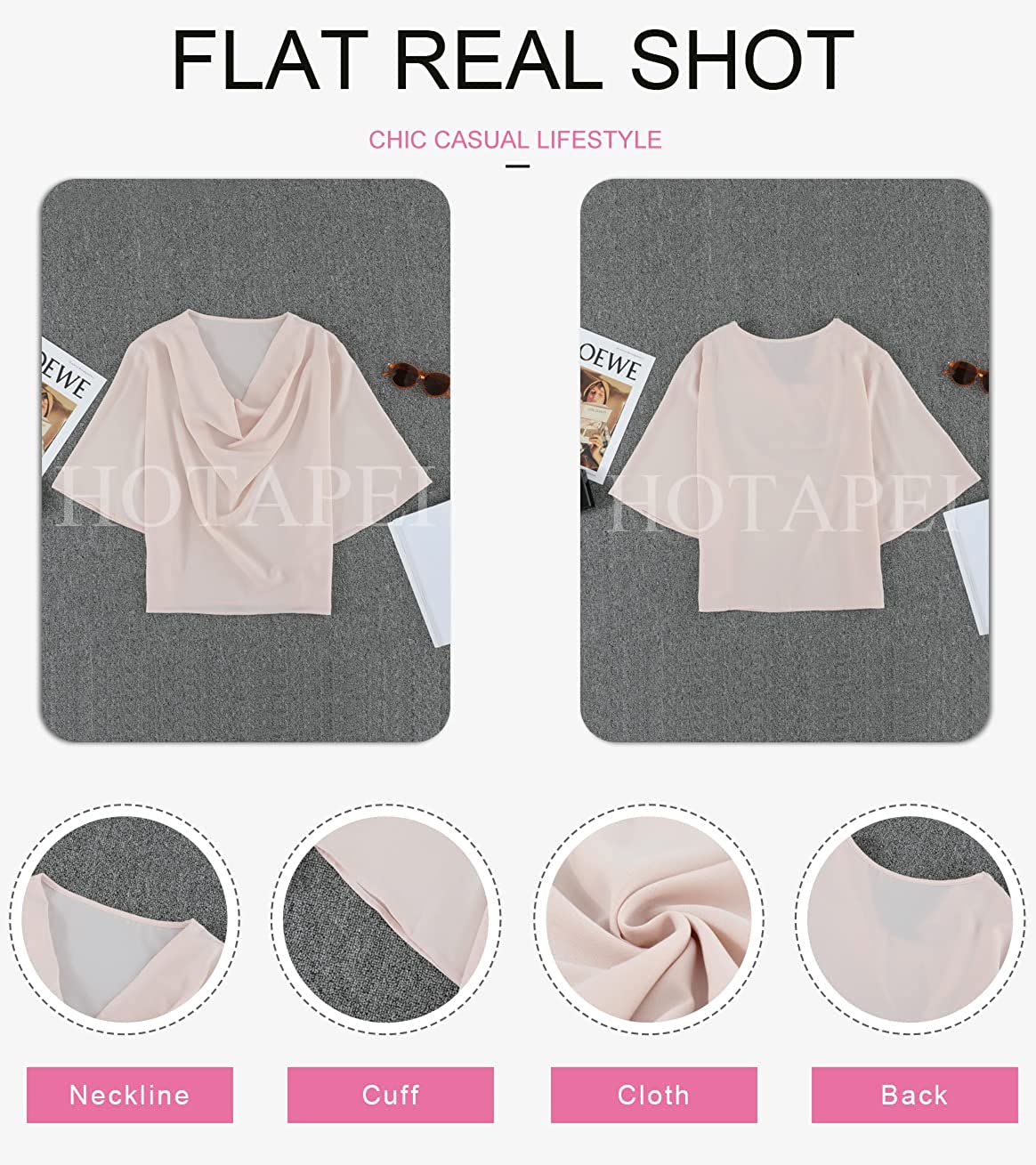 Design: Cute summer tops designed with a loosely draped front, crepey fabric.