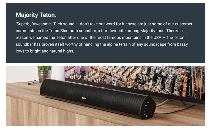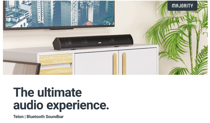 - CRYSTAL CLEAR SOUND QUALITY: The Majority Teton is a powerful TV sound bar packed with the latest audio technology and compatible with a wide range of household items such as your phone, TV, PC, laptop, projector, monitor, Blu-Ray or DVD player. Feel true cinematic surround sound in your own home and enjoy an immersive listening experience when connecting via HDMI ARC, Optical or Bluetooth.