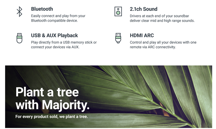 - PACKED FULL OF FEATURES: Our Majority soundbar has been designed with ease of use in mind - simply plug in and play using the wide range of connections. Connect to your TV in lightning speed by using the HDMI ARC or optical input for high clarity and rich audio. Listen to your playlists straight from your phone through the latest Bluetooth technology, plug in your MP3 player to the AUX or USB input.