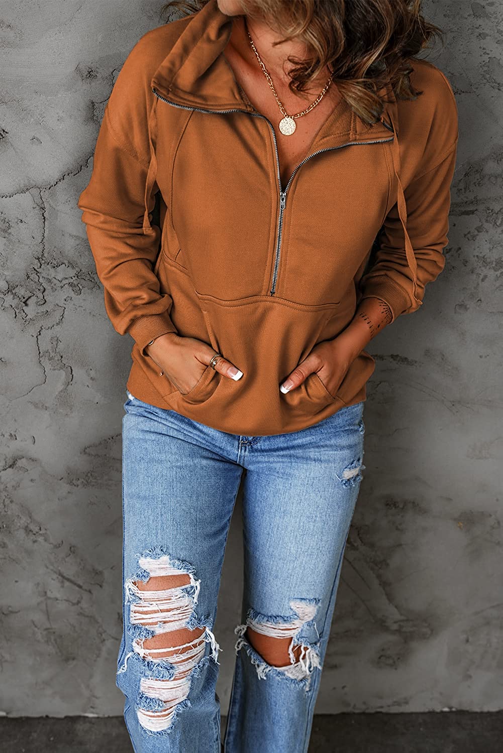 Features: Half zip pullover women, Solid color cute sweatshirts for women, Lapel half zip up sweatshirt women, Womens sweatshirt no hood, Long Sleeve pullover sweatshirts for women, Ribbed cuffs, 1 front big pocket, Oversized sweatshirt for women, Soft zipper fall sweatshirts for women loose fit, Casual womens sweatshirts no hood, Drawstring neck womens oversized sweatshirts, Quarter zip pullover women