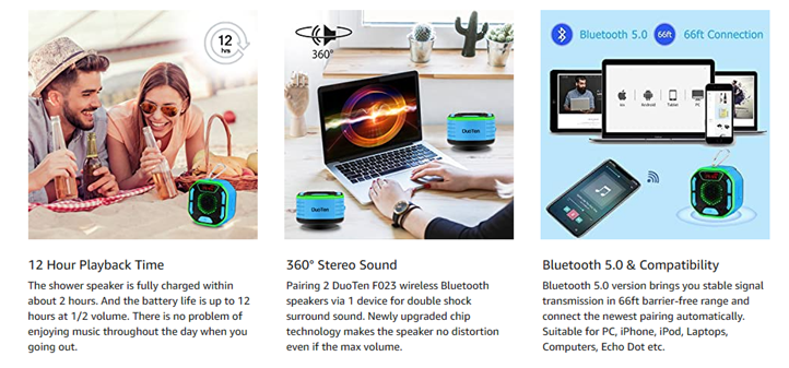 - TRUE WIRELESS STEREO FUNCTION-When you connect 2 units F023 wireless Bluetooth speakers through 1 device at the same time, the double shock surround sound can take you 360° all around sound stereo audio enjoyment. Newly upgraded chip technology makes the speaker no distortion even if the max volume. Great for friends gathering and you will like it!