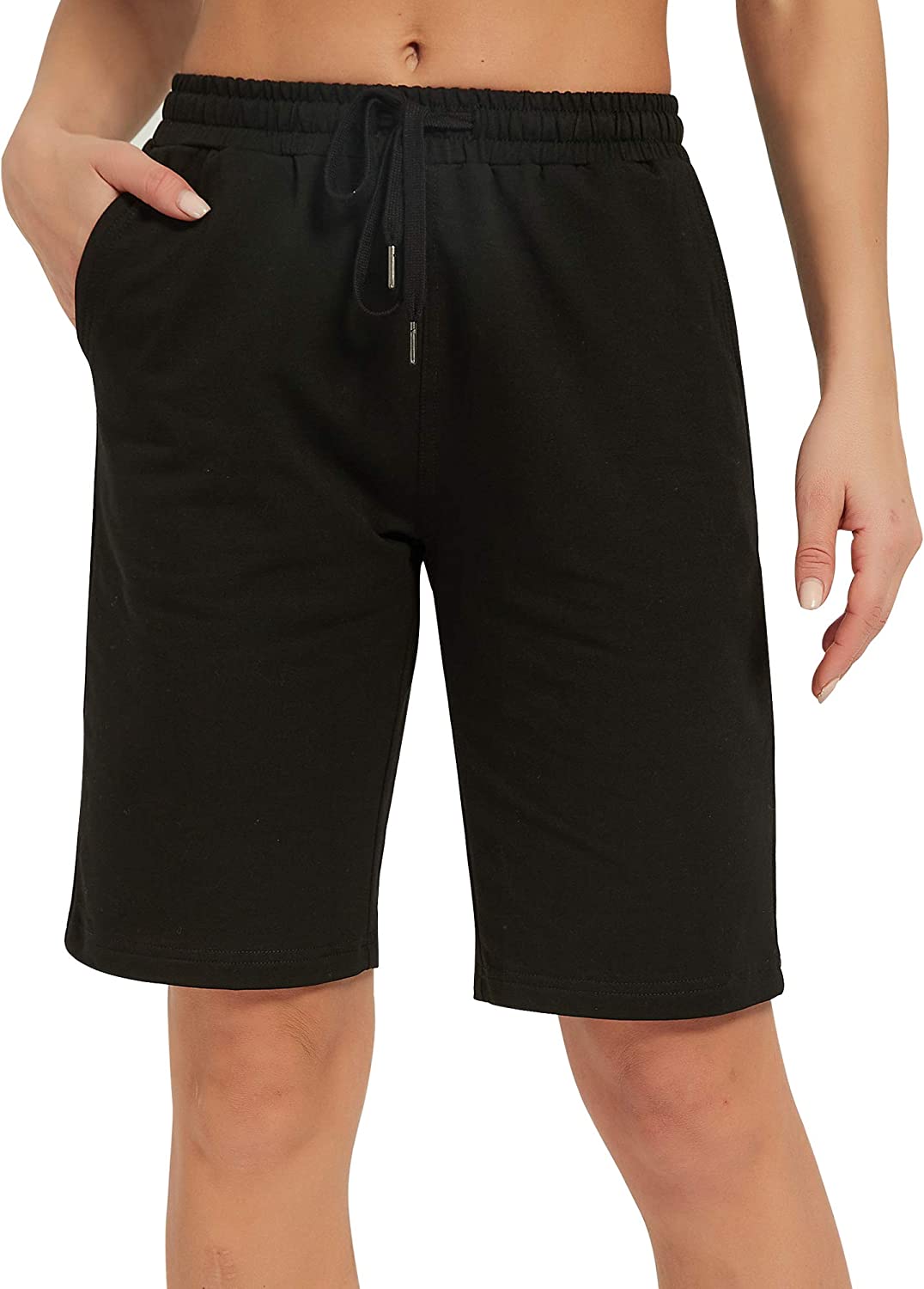 Material: This bermuda shorts made of 73% cotton, 20% polyester, 7% spandex. Cotton material give you comfy and breathable feeling. Spandex makes this sweat shorts stretchy, so you won't feel uncomfortable when you do any movement in this shortses, lounging around the house, etc.