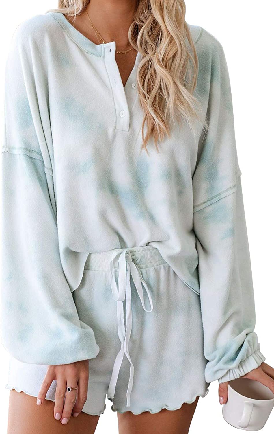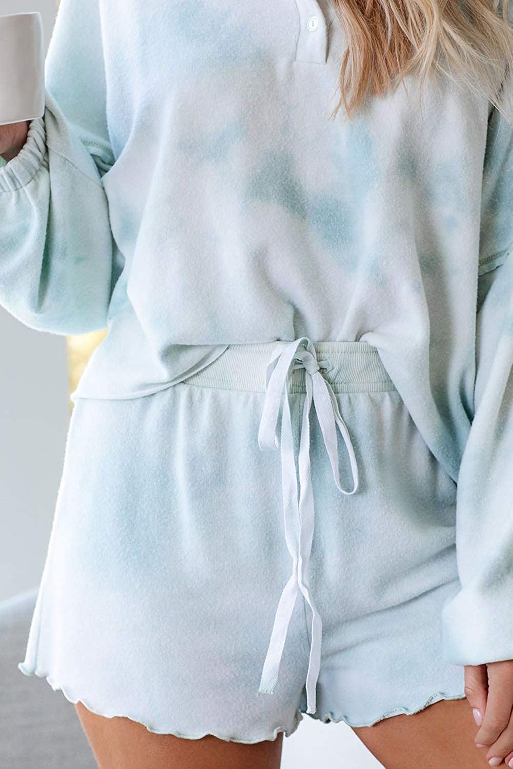 T1FE 1SFE Women's Tie-Dye Pajamas Lounge Sets Long-Sleeve Tops and Ruffle Shorts PJ Set Comfy Loungewear Sleepwear