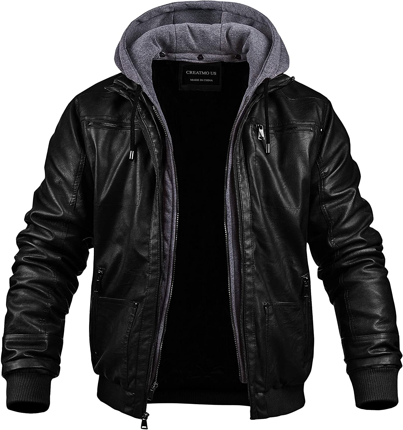 ▶ Windproof details--Leather hoodie is consist of inside removable knitted hood with placket and out zip closure placket provide great wind resistant.Thick lining, excellent seam,rib collar, cuffs and hem are comfortable as well as warm to against the skin and keep wind out.