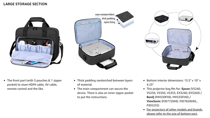 • LARGE STORAGE SECTION: The main compartment can secure the device. There is also an inner zipper pocket to put the instructions. This projector bag fits for Epson (VS240, VS250, VS350, VS355, EX3240, EX3260), BenQ (MH530FHD, MH535FHD), ViewSonic (PJD7720HD, PJD7828HDL, PJD5255). For projectors of other models and brands, please refer to the size of bottom part.
