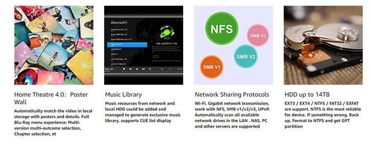 - 【Meet Blu-ray And Hi-Fi Need】4K HDR Media Player. 4K@60Hz, 12Bit, BD/UHD BDMV/ISO, MVC 3D(Blu-rayMKV), MKV, TS etc, will support all popular D Vision profiles ( P4, P5, P7, P8, MEL / FEL ). AUDIO lossless playback, including master-level DSD: SACD ISO, DFF, DSF, Lossless CD: WAV, APE, FLAC. Up to DSD256 / PCM192Khz sampling rate, HDMI and SPDIF output, fully meet your Hi-Fi need