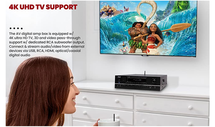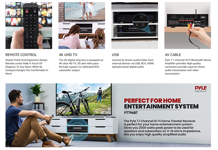 Features: - 7.1 Channel Receiver System - AV (Audio/Video) Stereo Amplifier - Hi-Fi Home Theater Surround Sound - Built-in Bluetooth Wireless Audio Streaming - Next-Gen Audio DSP Sound Processing Technology - 4K Ultra HD TV Pass-Through Support - 3D Video & Blue-Ray Video Pass-Through Support - Digital Dynamic VFD Display with AM/FM Radio - Connect & Stream Audio from External Devices - MP3 Digital Audio Support - USB Flash Drive Reader - Connection Interface: (3 IN+1 OUT) x HDMI, RCA (L/R), Speaker Binding Posts, Optical / - COAX Digital Audio - HDMI Output + Dedicated RCA Subwoofer Output - (2) 1/4’’ -inch Microphone Inputs - Independent Input Source Selection - Digital Graphic Audio Output Level Display - Mic Echo, Bass, Treble, Volume Control Adjustment - Over Current, Short Circuit, and Over Voltage Protection Wireless Bluetooth Connectivity: - Simple & Hassle-Free Pairing - Instantly Receives Wireless Music Streaming - Works with all of Today’s Latest Devices - Smartphones, Tablets, Laptops, Computers, etc.) - Bluetooth Version: 5.0 - Bluetooth Network Name: ‘PYLE PRO’ - Wireless Range: 30’+ ft. What’s in the Box: - AV Receiver - Remote Control - Power Cable Technical Specs: - Power Output: 2000 Watt MAX - Amplifier Receiver Type: 7.1-Channel - Speaker Impedance: 4-16 Ohm - S/N Ratio: >80dB - T.H.D.: <0.05% - Radio Station Memory: 30 Presets - Digital Audio File Support: MP3 / WMA/APE/FLAC - Maximum USB Flash Support: Up to 1TB - Battery Operated Remote Control, Requires (2) x ‘AAA’ Batteries, Not Included - Power Cable Length: 3.9’ ft. - Power Supply: 115V/240V, switchable - Total Unit Dimensions (L x W x H): 16.9’’ x 13.8’’ x 5.5 ’’ -inches.