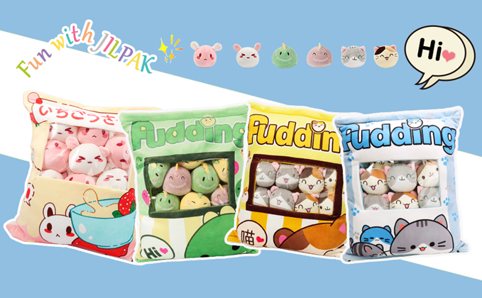 You could not miss this ultra-soft pudding plush pillow with a bag of fluffy stuffed animals!!!